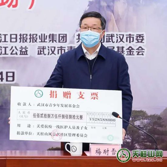 中共潛山市委書記張勁松出席捐贈儀式并致辭,市委副書記、市人民政府市長、天柱山管委會主任梅耐雪代表天柱山管委會向長江日報長江公益、武漢市青少年發(fā)展基金會捐贈資金5285880元,市委常委、天柱山管委會副主任涂高生,市人民政府副市長蔡婷婷出席儀式。長江日報報業(yè)集團負(fù)責(zé)人出席儀式并講話,共青團武漢市委負(fù)責(zé)人向天柱山管委會頒發(fā)榮譽證書,天柱山風(fēng)景區(qū)、長江日報長江公益、武漢市青少年發(fā)展基金會三方代表簽訂《天使的孩子—關(guān)愛武漢抗疫醫(yī)護人員及子女·天柱山基金》協(xié)議書。