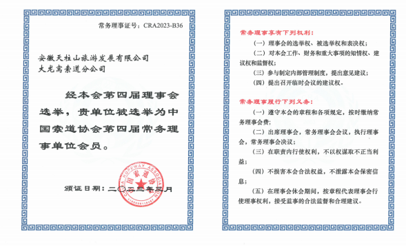 安徽天柱山旅游發(fā)展有限公司大龍窩索道分公司成為中國索道協(xié)會常務(wù)理事單位之一,是天柱山大龍窩索道發(fā)展史上重要的一步,有利于促進天柱山大龍窩索道與中國索道協(xié)會及相關(guān)企業(yè)的交流與合作,促進行業(yè)協(xié)會的資源共享和優(yōu)勢互補,進一步拓展大龍窩索道在索道技能項目領(lǐng)域的專業(yè)度、創(chuàng)新性和影響力。同時,大龍窩索道作為常務(wù)理事單位,也將積極履行職責(zé)和義務(wù),促進組織發(fā)展和提高人才資源素質(zhì)。發(fā)揮天柱山大龍窩索道在索道協(xié)會常務(wù)理事單位職能,助推中國索道行業(yè)的高質(zhì)量發(fā)展具有里程碑的意義。(文:汪全龍)